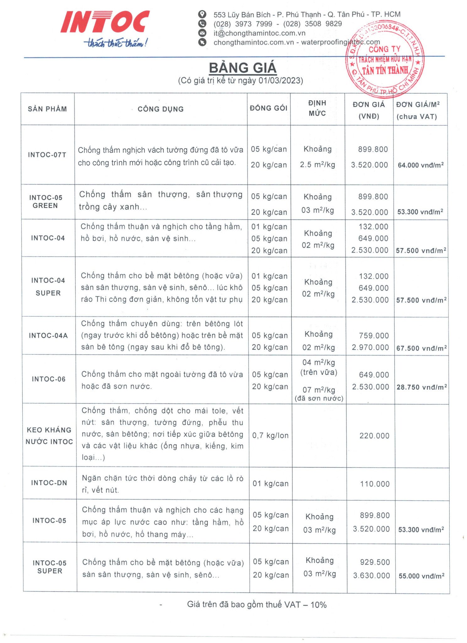 BẢNG BÁO GIÁ INTOC NĂM 2023