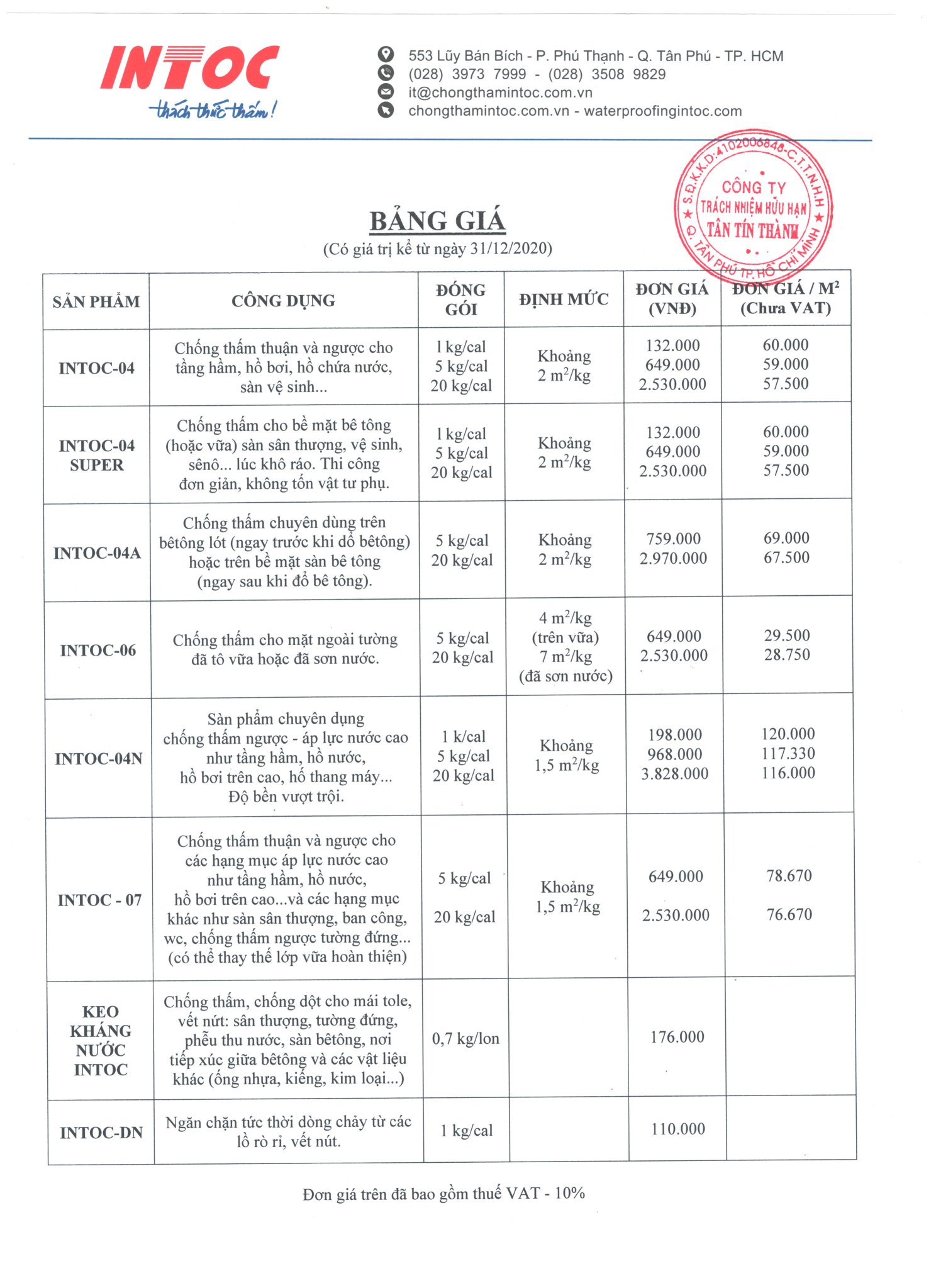 BẢNG BÁO GIÁ THỊ TRƯỜNG CHỐNG THẤM INTOC NĂM 2021