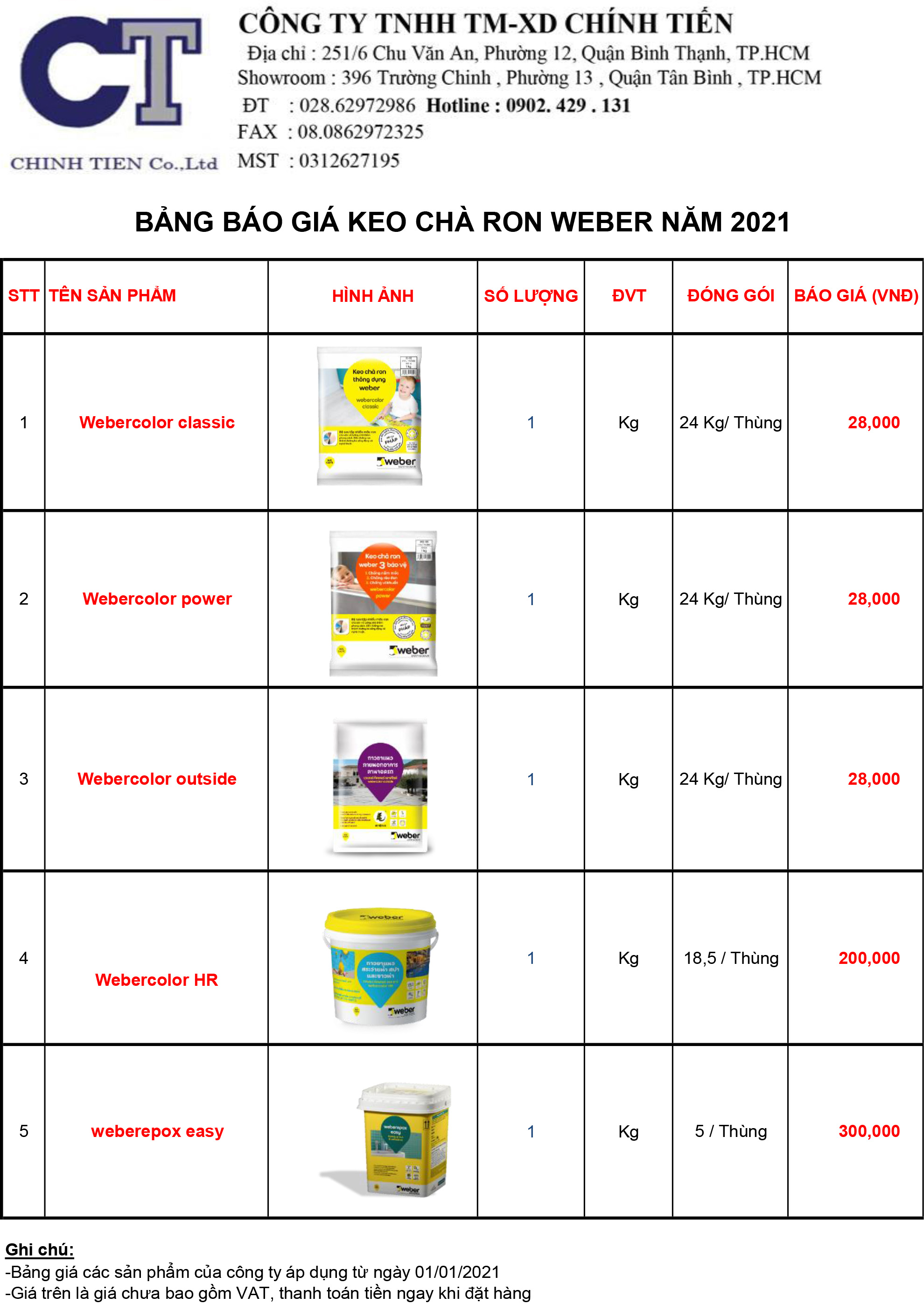 BẢNG BÁO GIÁ KEO CHÀ RON WEBER NĂM 2021