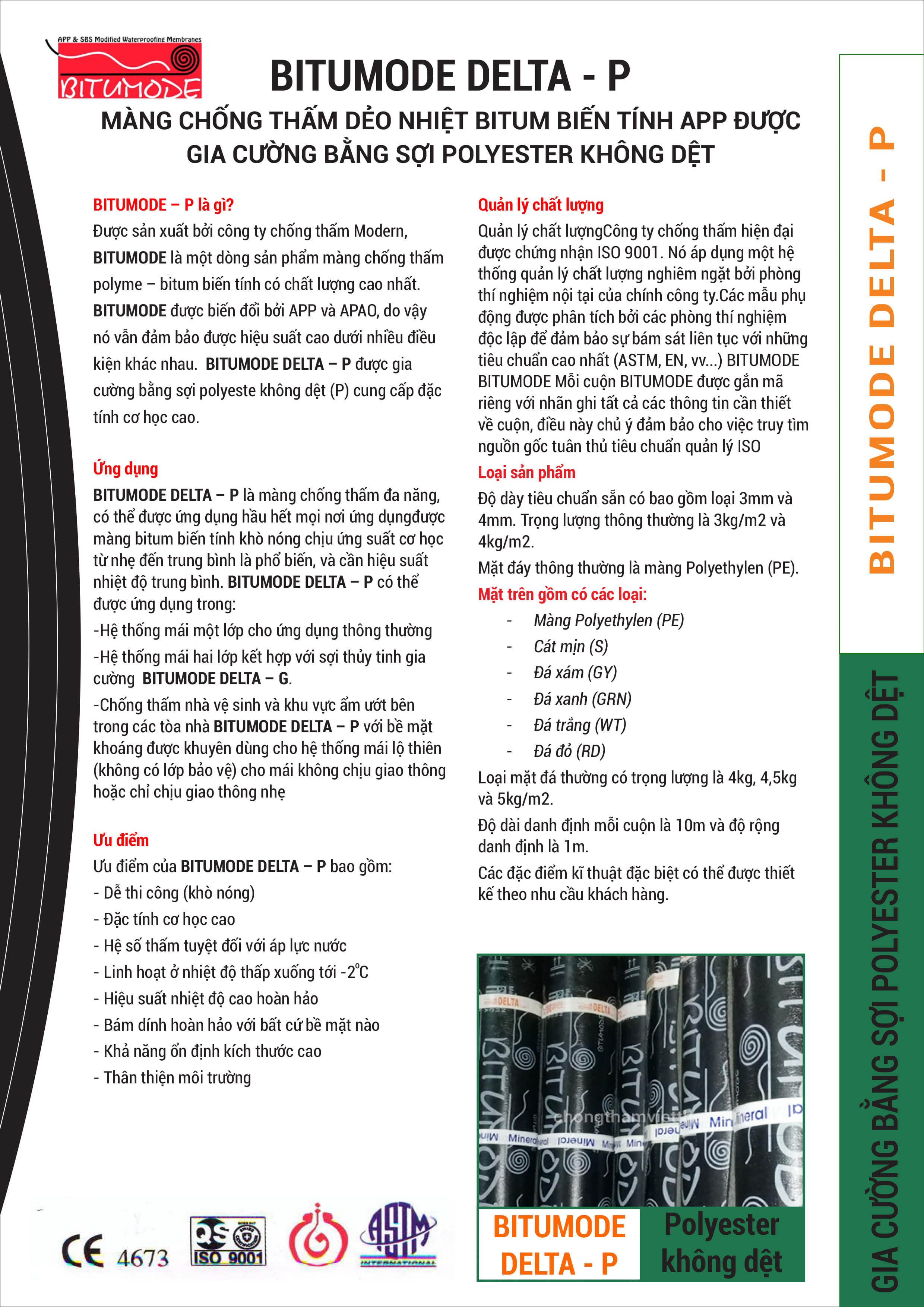 nó vẫn đảm bảo được hiệu suất cao dưới nhiều điều kiện khác nhau. BITUMODE DELTA – P được gia cường bằng sợi polyeste không dệt (P) cung cấp đặc tính cơ học cao.