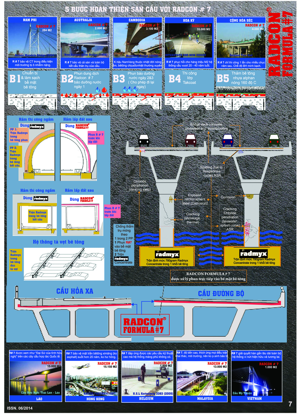 Là một lớp màng phủ ẩn bên dưới bề mặt bêtông, Radcon Formula #7 hình thành một lớp gel silicate dày tới 20mm bên trong thân vỏ của bêtông, lớp gel này kiến tạo nên lớp rào cản liên tục để ngăn chặn sự xâm thực của nứơc và Ion Clorua. Khác với các vật liệu phủ trên bề mặt, Radcon Formula #7® không phải chịu đựng những tổn hại cơ học, nguy cơ bị bong rộp, chịu đựng các lỗ thủng rách, hoặc gây ra sự bong rộp giữa lớp phủ át-phan và lớp bêtông xi măng. Hơn nữa, nó còn có những khả năng như một hệ thống màng phủ để phát triển các khả năng phục vụ cho kết cấu của bêtông qua việc hàn gắn các đường nứt hiện hữu và tiếp tục hàn gắn các đường nứt sốc nhiệt của bêtông sau này theo nhiều cơ chế khác nhau.