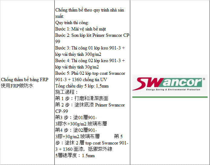 – Thi công 2 lớp keo Swancor 901-3 + Lớp vải thủy tinh 300g /m2